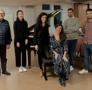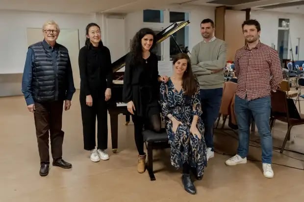 Une partie de l’équipe artistique : Philippe Malidin (ingénieur du son), Xiaomo Zhang (pianiste), Mathilde Kohn (chef de chœur et soliste), Anne-Sophie Rahm, Arnaud Bahuaud (pianiste) et Gaël Lefèvre (soliste)