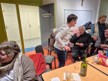 Concert de Noël 2025 à Andrevetan. Cantiques et chants traditionnels auprès des résidents du service alzheimer et de la centenaire du jour Mme Suzanne J, autour d'un goûter festif.